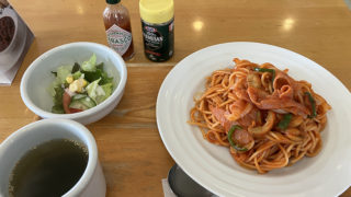 青森県弘前市亀甲町90-1 、 cafe KITAMON (カフェ キタモン) ナポリタン、cafe KITAMON (カフェ キタモン) わかめそばと豚焼き肉丼 オムレツンレー えびたまピラフ オムライス