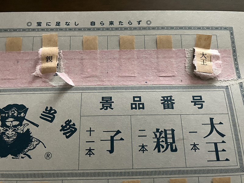 大王、大当たり1本。親、当たり2本。子ざんねん11本。