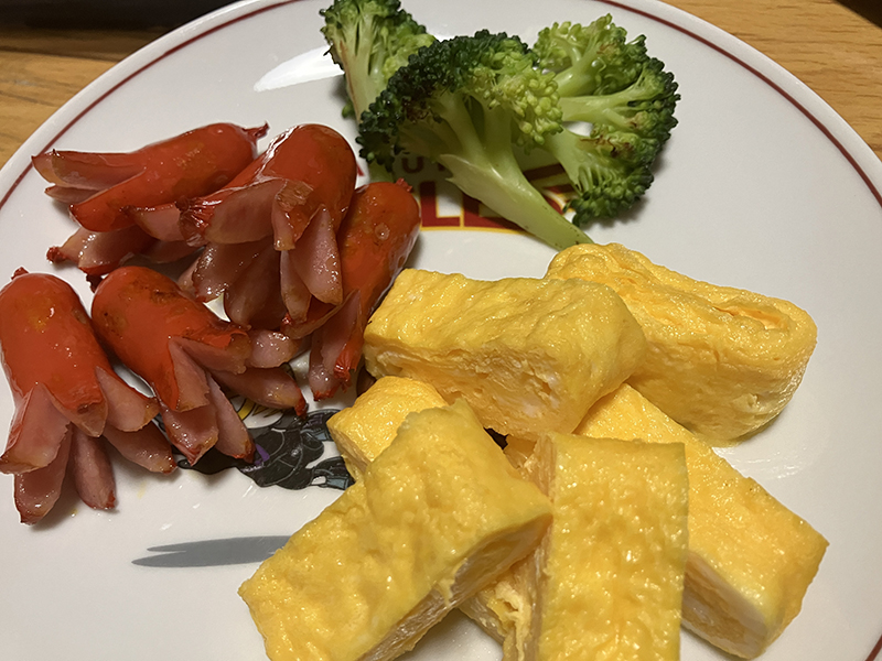 たこちゃんの赤ウィンナーと玉子焼きとブロッコリー