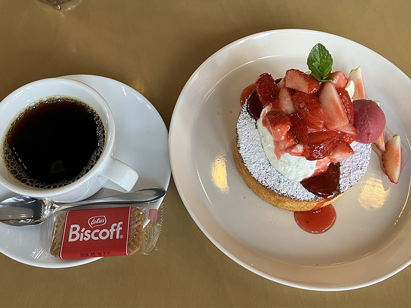 苺のホットケーキとコーヒーのセット